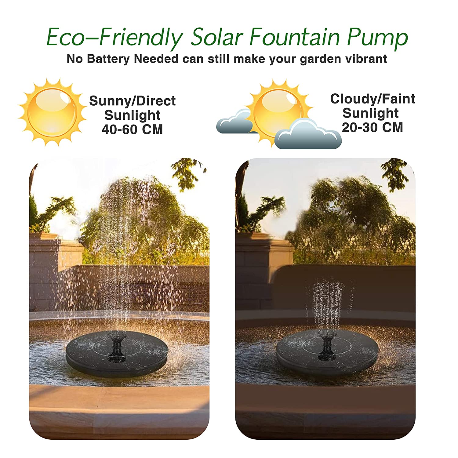 ● Kindly let the solar power fountain kit get full exposure to sunshine to work effectively, avoid shadow blocking the sunlight. For optimal performance, we suggest a sunny day with temperature at least 24°C / 75°F