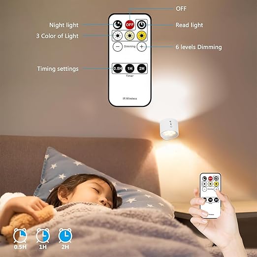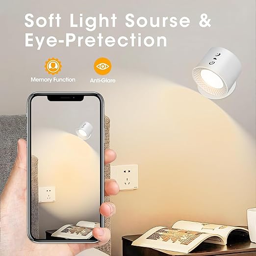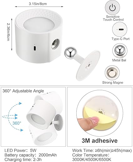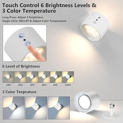 Reading light: 3 color temperatures (3000K/4500K/6500K) and 3 brightness levelsNight light: 1 Temperature (3000K) and 3 Brightness LevelWall Lights with LED Built-in, Rechargeable, Battery Operated, Wireless/Wireless UseMagnetic design, freely install and release. 360 degree rotation lightingTimer setting and memory function2 control types: Remote control and touch controlPackage includes: 1 x remote control, 1 x wall light, 1 x adhesive base, 1 x type C cable, 1 x user manual (English language not guaranteed)