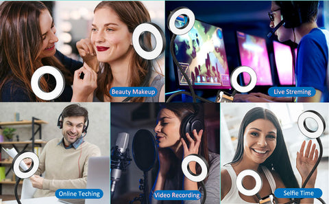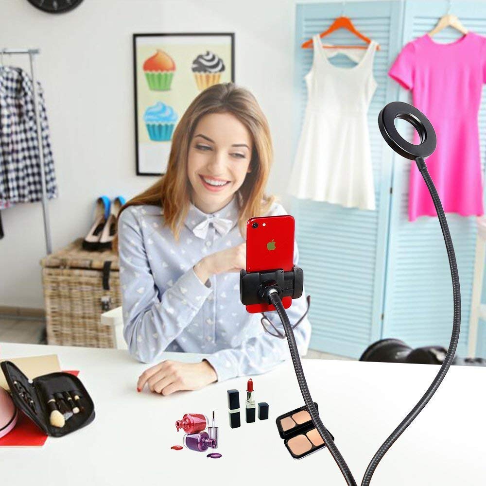 【Flexible】- 24 inch strong long gooseneck arm that can bend to any shape, 360 degree rotating lazy bracket clip. Adjust to any angle (face downwards, portrait and landscape) to free your hands for livestream, live broadcast, lives Show, Selfie or video chat, or just works as desk tabletop lamp.